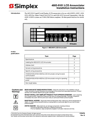 Installation Manual for the Simplex 4603-9101, published in 2016. Document No: 579-979, Rev: E. Model 4603-9101. Physical installation guide, backbox dimensions, and cabling specifications.