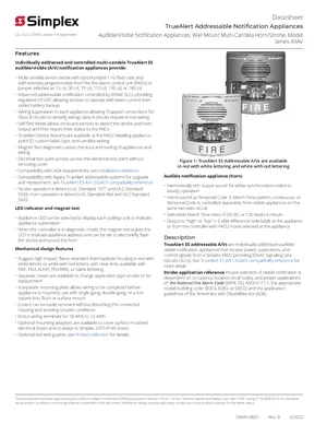 Datasheet for the Simplex 49AV Series Notification Appliances, published in 2022. Document No: S49AV-0001, Rev: 9. 21 models including 49AV-WRF, 49AV-WRF-BA, 49AV-WWF and 18 additional variants. Detailed technical specifications, electrical ratings, and agency listings.