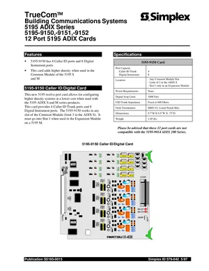 Datasheet for the Simplex 5195 ADIX Series Cards, published in 1997. Document No: S5195-0015. Models 5195-9150, 5195-9151 and 5195-9152. Engineering specifications, wiring diagrams, and mounting dimensions.