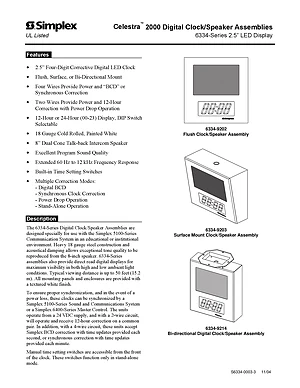 Datasheet for the Simplex 6334 Series Digital Clock/Speaker, published in 2004. Document No: S6334-0003-3. Models 6334-9202, 6334-9203 and 6334-9214. Detailed technical specifications, electrical ratings, and agency listings.