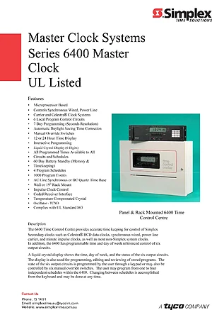 Datasheet for the Simplex 6400 Series Master Clock. Model 6400. Product features, environmental operating limits, and compatibility data.