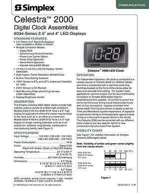 Datasheet for the Simplex Celestra 2000 Digital Clock, published in 1999. Document No: S6334-0001-2. 12 models including 6334-9125, 6334-9126, 6334-9127 and 9 additional variants. Engineering specifications, wiring diagrams, and mounting dimensions.