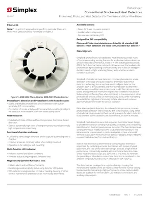 Datasheet for the Simplex Conventional Smoke and Heat Detectors, published in 2023. Document No: S4098-0059, Rev: 1. 8 models including 4098-5601, 4098-5602, 4098-5603 and 5 additional variants. Product features, environmental operating limits, and compatibility data.
