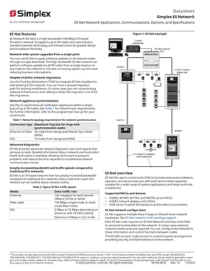 Datasheet for the Simplex ES Net Network Applications, Communications, Options, published in 2025. Document No: S4100-0076, Rev: 19. 5 models including 4100ES, 4010ES, 4017ES and 2 additional variants. Detailed technical specifications, electrical ratings, and agency listings.