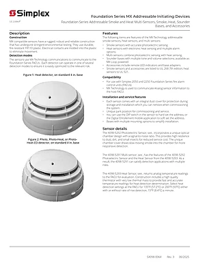 Datasheet for the Simplex Foundation Series Addressable Initiating Devices, published in 2025. Document No: S4098-0064, Rev: 3. 7 models including 4098-5291, 4098-5292, 4098-5293 and 4 additional variants. Product features, environmental operating limits, and compatibility data.