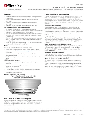 Datasheet for the Simplex TrueAlarm Multi-Sensor 4098-9764, published in 2024. Document No: S4098-0027, Rev: 5. 4 models including 4098-9764, 4098-9764BA, 4098-9764IND and 1 additional variants. Product features, environmental operating limits, and compatibility data.