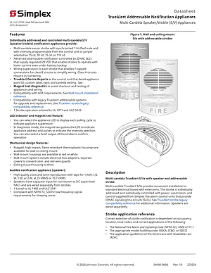 Datasheet for the Simplex TrueAlert Multi-Candela Speaker/Visible Appliances, published in 2026. Document No: S4906-0006, Rev: 10. 6 models including 4906-9251, 4906-9253, 4906-9254 and 3 additional variants. Detailed technical specifications, electrical ratings, and agency listings.