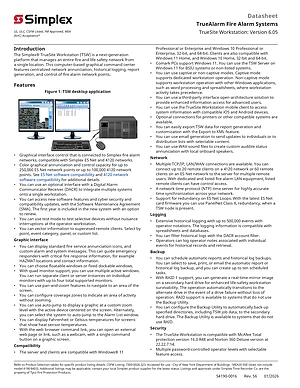 Datasheet for the Simplex TrueSite Workstation v6.05, published in 2026. Document No: S4190-0016, Rev: 56. Model TrueSite Workstation. Engineering specifications, wiring diagrams, and mounting dimensions.