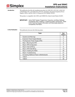 Installation Manual for the Simplex XPS and XNAC, published in 2011. Document No: 574-772, Rev: K. 4 models including 4100-5101, 4100-5102, 4100-5103 and 1 additional variants. Physical installation guide, backbox dimensions, and cabling specifications.