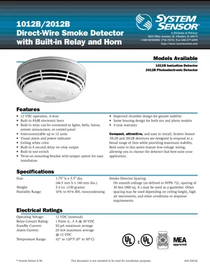 Datasheet for the System Sensor 1012B and 2012B, published in 1996. Document No: A05-238-02, Rev: 02. Models 1012B, 2012B and A77-727-01. Engineering specifications, wiring diagrams, and mounting dimensions.