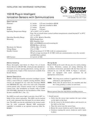 Installation Manual for the System Sensor 1551B, published in 1999. Document No: I56-1436-00, Rev: 00. 13 models including 1551B, B501B, B501 and 10 additional variants. Mounting instructions, wiring diagrams, and system power-up procedures.