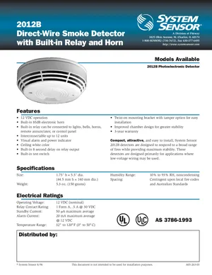 Datasheet for the System Sensor 2012B Smoke Detector, published in 1996. Document No: A05-263-03, Rev: 03. Model 2012B. Detailed technical specifications, electrical ratings, and agency listings.