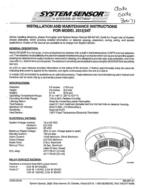 Installation Manual for the System Sensor 2312/24T, published in 1991. Document No: I56-431-01, Rev: 01. 6 models including 2312/24T, MOD400R, A77-716-01 and 3 additional variants. Physical installation guide, backbox dimensions, and cabling specifications.