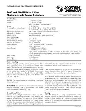 Installation Manual for the System Sensor 2400 and 2400TH, published in 2004. Document No: I56-285-05R, Rev: 05R. 5 models including 2400, 2400TH, RA400Z and 2 additional variants. Physical installation guide, backbox dimensions, and cabling specifications.