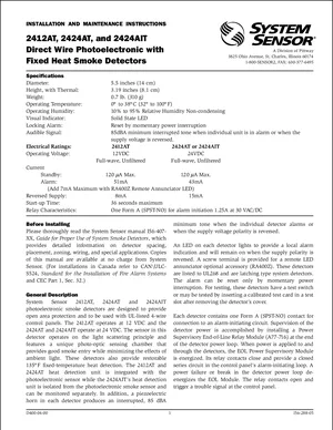 Installation Manual for the System Sensor 2412AT, 2424AT, and 2424AIT, published in 1996. Document No: I56-288-05, Rev: 05. Models 2412AT, 2424AT and 2424AIT. Hardware installation, terminal connections, and environmental requirements.