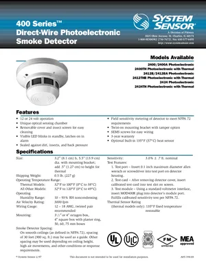 Datasheet for the System Sensor 400 Series Direct-Wire Photoelectronic Smoke Detector, published in 1997. Document No: A05-194-03, Rev: 03. 8 models including 2400, 2400A, 2400TH and 5 additional variants. Detailed technical specifications, electrical ratings, and agency listings.