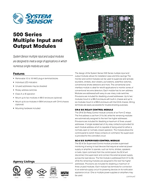 Datasheet for the System Sensor 500 Series Input/Output Modules, published in 2014. Document No: MDDS37101, Rev: 4/14. 6 models including CR-6, SC-6, CZ-6 and 3 additional variants. Engineering specifications, wiring diagrams, and mounting dimensions.