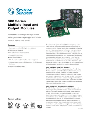 Datasheet for the System Sensor 500 Series Multiple Input and Output Modules, published in 2014. Document No: MDDS37101, Rev: 4/14. 9 models including CR-6, SC-6, SYNC-1 and 6 additional variants. Engineering specifications, wiring diagrams, and mounting dimensions.