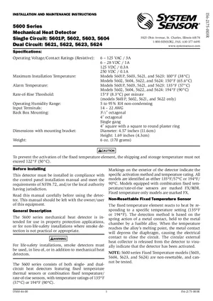 Installation Manual for the System Sensor 5600 Series Mechanical Heat Detectors, published in 2009. Document No: I56-2175-003R, Rev: 003R. 8 models including 5601P, 5602, 5603 and 5 additional variants. Physical installation guide, backbox dimensions, and cabling specifications.