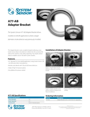 Datasheet for the System Sensor A77-AB Adapter Bracket, published in 2006. Document No: A05-0971-001, Rev: 9/06. Models A77-AB, 100 Series and 400 Series. Engineering specifications, wiring diagrams, and mounting dimensions.