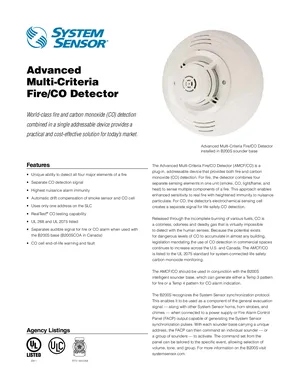 Datasheet for the System Sensor AMCF/CO Fire/CO Detector, published in 2011. Document No: SPDS76101, Rev: 1/12. 5 models including AMCF/CO, B200S, B200SCOA and 2 additional variants. Engineering specifications, wiring diagrams, and mounting dimensions.