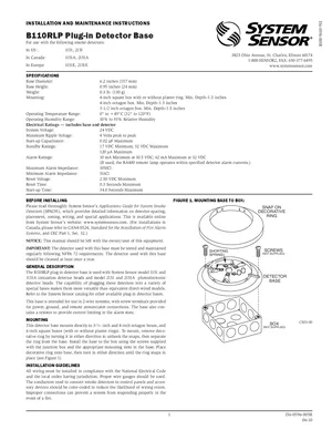 Installation Manual for the System Sensor B110RLP, published in 2016. Document No: I56-0596-005R, Rev: 005R. 7 models including B110RLP, 1151, 2151 and 4 additional variants. Physical installation guide, backbox dimensions, and cabling specifications.