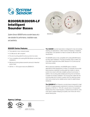 Datasheet for the System Sensor B200SR Series Bases, published in 2015. Document No: SPDS53802, Rev: 02/15. Models B200SR and B200SR-LF. Engineering specifications, wiring diagrams, and mounting dimensions.