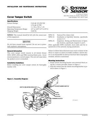 Installation Manual for the System Sensor Cover Tamper Switch, published in 1996. Document No: I56-403-03, Rev: 03. Model Cover Tamper Switch. Physical installation guide, backbox dimensions, and cabling specifications.