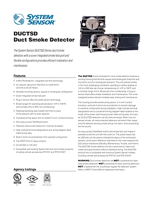 Datasheet for the System Sensor DUCTSD, published in 2015. Document No: HVDS84401. Model DUCTSD. Detailed technical specifications, electrical ratings, and agency listings.