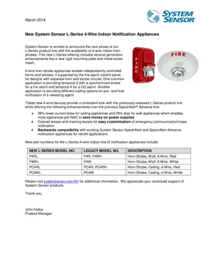 Brochure for the System Sensor L-Series 4-Wire Notification, published in 2018. 4 models including P4RL, P4WL, PC4RL and 1 additional variants. Product highlights, key features, and application overview.