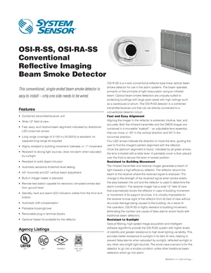 Datasheet for the System Sensor OSI-R-SS and OSI-RA-SS, published in 2019. Document No: BMDS904-01, Rev: 01. 9 models including OSI-R-SS, OSI-RA-SS, OSP-002 and 6 additional variants. Product features, environmental operating limits, and compatibility data.