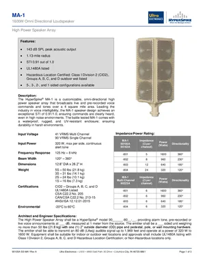 Datasheet for the Ultra Electronics MA-1. Document No: 90105A-SS-MA1, Rev: A. 4 models including MA-1, 90105A, 90223A and 1 additional variants. Detailed technical specifications, electrical ratings, and agency listings.