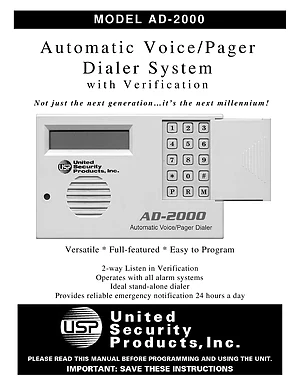 Installation, Operations, and Programming Manual for the United Security Products AD-2000, published in 1998. Model AD-2000. Mounting and wiring instructions, user operating guides, and system software setup.