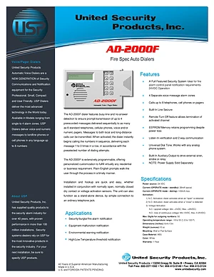 Datasheet for the United Security Products AD-2000F. Model AD-2000F. Detailed technical specifications, electrical ratings, and agency listings.