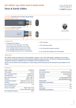 Datasheet for the Ventcroft NKT INSTAL Twin & Earth Cables, published in 2025. 31 models including 6242Y, 6243Y, 6242B and 28 additional variants. Product features, environmental operating limits, and compatibility data.