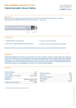 Datasheet for the Ventcroft PRO-Supreme LSZH Alarm Cables. 8 models including VSZ-4WT, VSZ-6W, VSZ-8WT and 5 additional variants. Engineering specifications, wiring diagrams, and mounting dimensions.