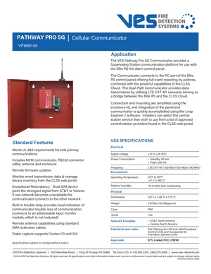 Datasheet for the VES Pathway Pro 5G, published in 2024. Document No: VF1660-00. Models VF1660-00 and Pathway Pro 5G. Detailed technical specifications, electrical ratings, and agency listings.