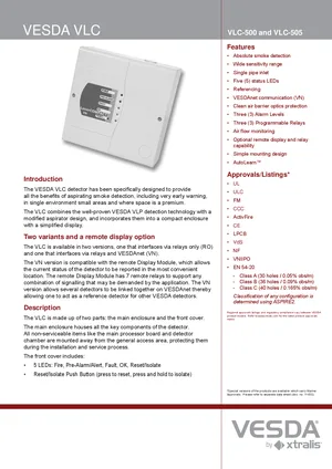 Datasheet for the VESDA VLC-500 and VLC-505. Document No: 09362, Rev: 22. 5 models including VLC-500, VLC-505, VRT-J00 and 2 additional variants. Detailed technical specifications, electrical ratings, and agency listings.