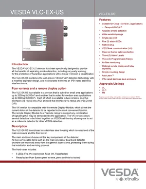 Datasheet for the VESDA VLC-EX-US. Document No: 21566_01, Rev: 01. 13 models including VLC-EX-US, VLC-205-EX-US, VLC-200-EX-US and 10 additional variants. Detailed technical specifications, electrical ratings, and agency listings.
