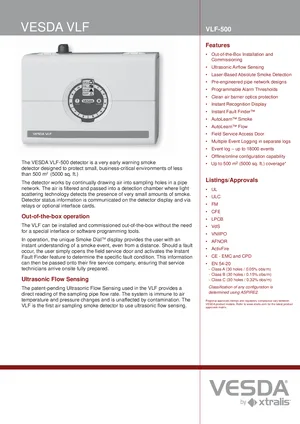 Datasheet for the VESDA VLF-500. Document No: 10046, Rev: 19. 11 models including VLF-500, VLF-500-00, VLF-500-01 and 8 additional variants. Engineering specifications, wiring diagrams, and mounting dimensions.