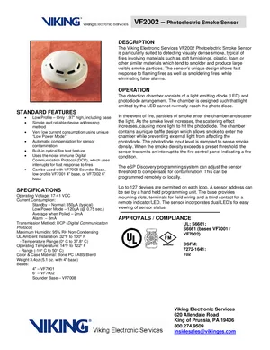 Datasheet for the Viking VF2002 Smoke Sensor. 6 models including VF2002, VF7001, VF7002 and 3 additional variants. Engineering specifications, wiring diagrams, and mounting dimensions.