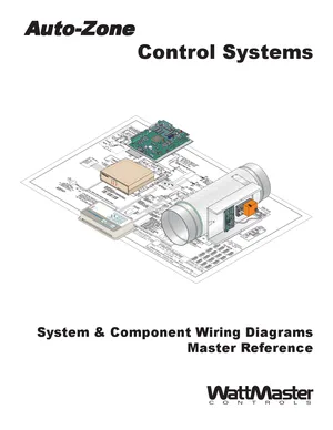 Installation and Wiring Diagram for the WattMaster Auto-Zone, published in 2002. Document No: WM-AZA-WD-01F, Rev: F. 12 models including Auto-Zone, System Manager, Zone Manager and 9 additional variants. Complete wiring configurations and interface requirements with detailed wiring schematics and riser diagrams.