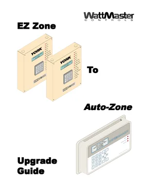 Manual for the WattMaster EZ Zone to Auto-Zone Upgrade Guide, published in 2000. Document No: WM-EZA-UG-01C, Rev: 01C. 16 models including EZ Zone, Auto-Zone, Auto-Zone Plus and 13 additional variants. Component descriptions, indicators and controls, and user interactions.