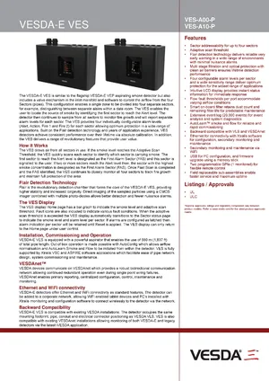 Datasheet for the Xtralis VESDA-E VES. Document No: 33728_02, Rev: 02. Models VES-A00-P and VES-A10-P. Detailed technical specifications, electrical ratings, and agency listings.