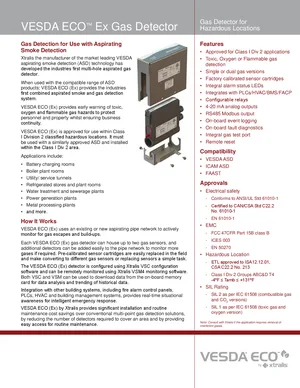 Datasheet for the Xtralis VESDA ECO Ex. Document No: 21716_08, Rev: 08. 5 models including VESDA ECO, ECO-D-B-AA-Ex, ECO-B-AA-BB-Ex and 2 additional variants. Detailed technical specifications, electrical ratings, and agency listings.